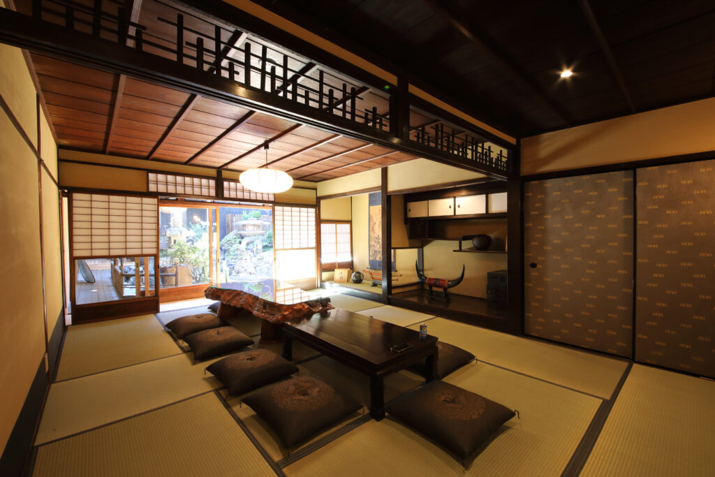 屋久杉大テーブルのあるリビング、ダイニング、 キッチン、和室、内庭、箱庭、露天風呂(庭の中) プライベートサウナ(準備中)、水風呂、檜風呂、トイレ