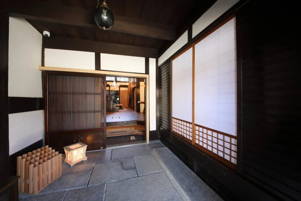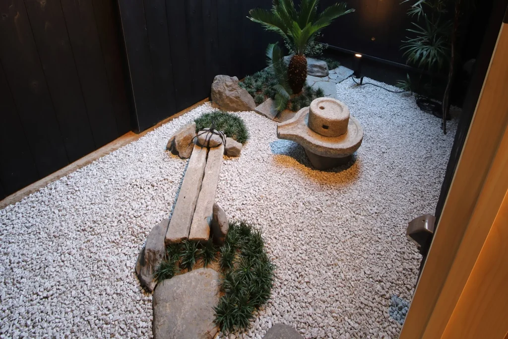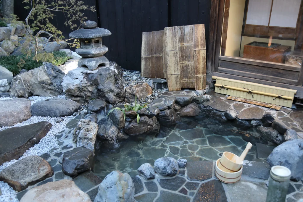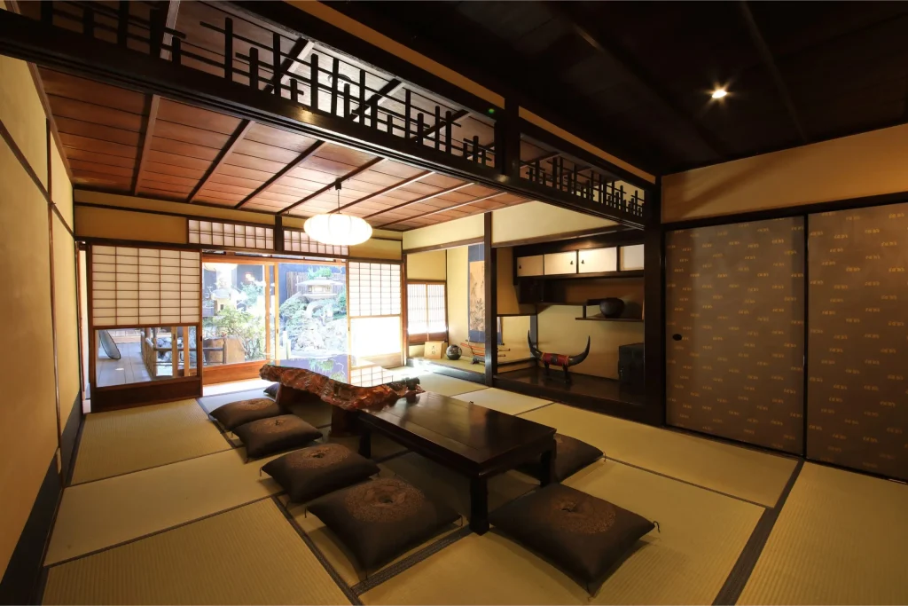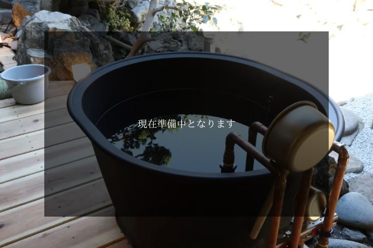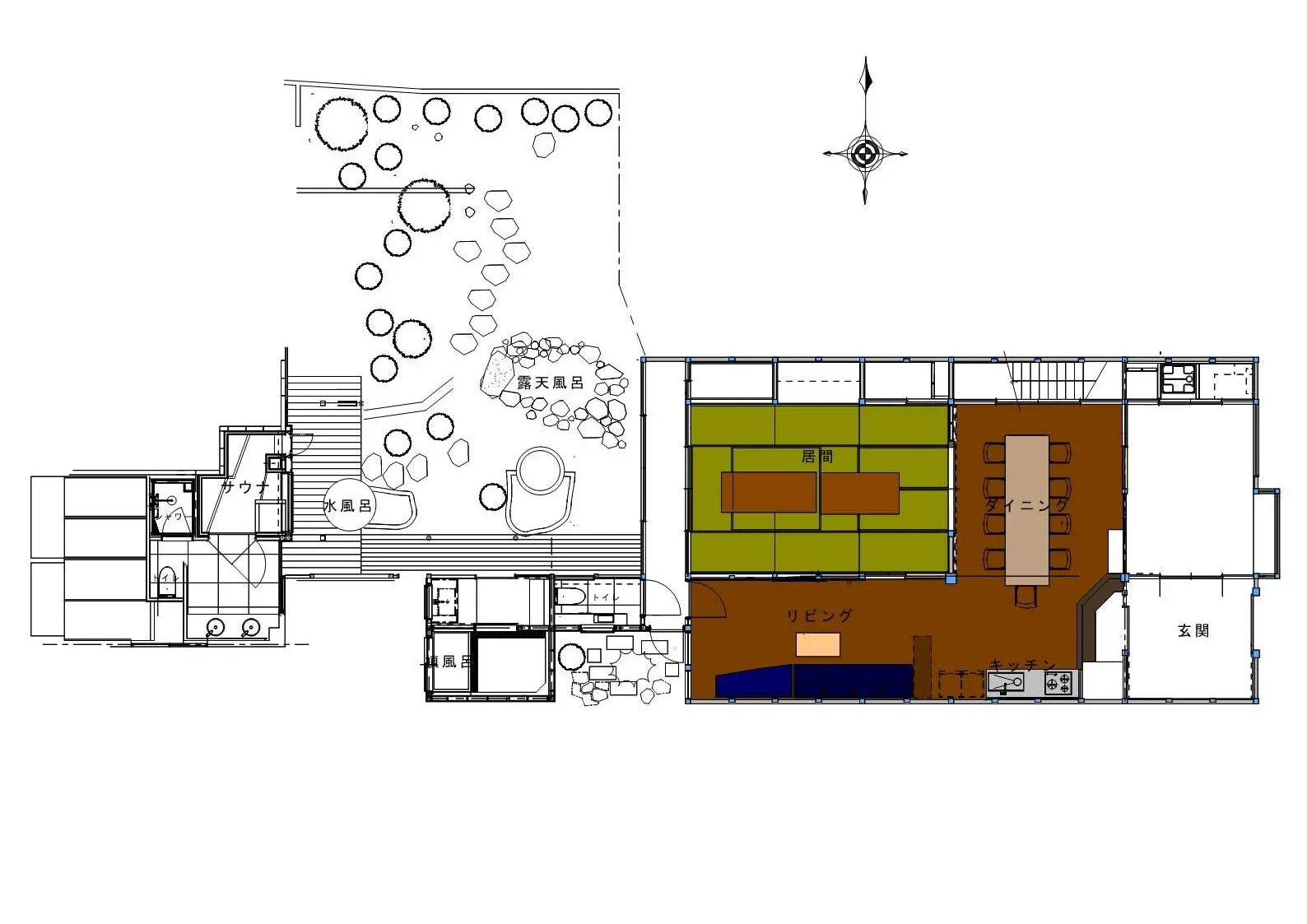 屋久杉大テーブルのあるリビング、ダイニング、 キッチン、和室、内庭、箱庭、露天風呂(庭の中) プライベートサウナ(準備中)、水風呂(準備中)、檜風呂、トイレ